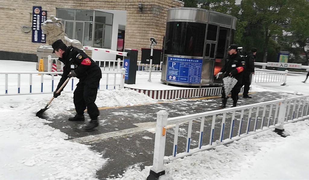 保卫处立即启动了雨雪冰冻天气应急处置预案,增加了5名值班巡查人员,对校内每一处道路及楼栋进行24小时无死角巡查。巡查期间,发现龙潭湖周边有路灯、树枝被大雪压倒,迅速对发现的安全隐患进行处理,及时汇报并联合后勤部门开展紧急抢修。雨雪冰冻天气给师生出行带来极大困难,保卫处封闭了大量存在安全隐患的路段,及时清理校内主干道及四处校园大门口的积雪,指引校内车辆绕道安全行驶,保障师生出行畅通。