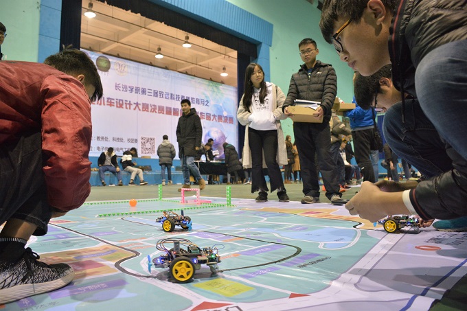 电信学院院长刘光灿介绍,面向全校新生开展的智能小车设计大赛历时两个月,从海选的103支队伍中选拔出33组进入决赛。每支队伍由三名选手组成,队员们需要通力合作控制小车完成曲线行走、推球入门两项挑战。