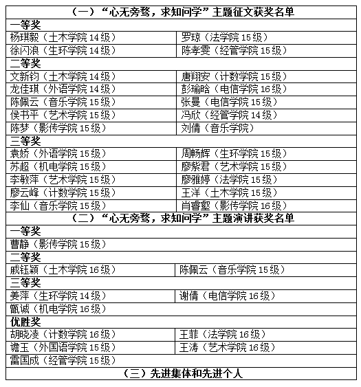 校关工委副主任李云龙宣读了表彰决定。会议对湖南省和学校2016-2017学年度“心无旁骛 求知问学”主题教育活动征文、演讲比赛获奖者、学生“奋进十佳”、“奉献十佳”获得者和2016-2017年度学校关工委工作先进集体和个人进行了表彰。与会领导为获奖师生颁奖。“奋进十佳”获奖者代表、土木工程学院2014级学生刘野分享了自己一路奋进的心路历程,激励在校学生勇敢追梦、奋力拼搏,争做有担当、负责任的奋进青年。