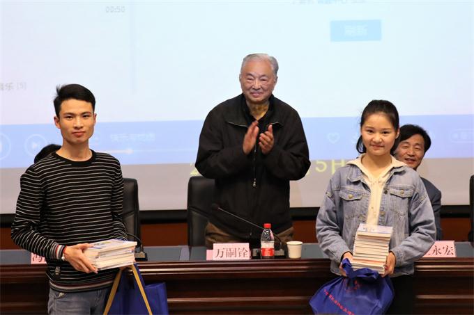 中国桥协特邀顾问、原北京市政协副主席万嗣铨讲话并向开云学生代表赠送桥牌用具
