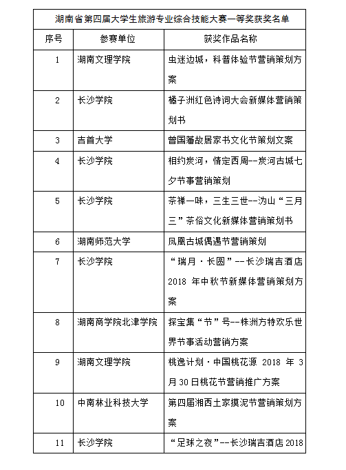 经过一天的紧张角逐,大赛共产生一等奖13个,二等奖19个,三等奖25个,优秀组织奖6个。湖南师范大学、中南林业科技大学、开云kaiyun官方网站等七所高校获一等奖。闭幕式还确定了下一届湖南省大学生旅游专业综合技能大赛由中南林业科技大学涉外学院承办。