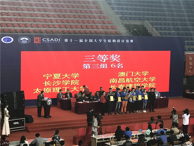 大学生结构设计竞赛是教育部确定的全国九大大学生学科竞赛之一,是土木工程学科培养大学生创新精神、团队意识和实践能力的最高水平学科竞赛,被誉为土木工程学科竞赛中的“奥林匹克”。本届竞赛由中国高等教育学会工程教育专业委员会、高等学校土木工程学科专业指导委员会、中国土木工程学会教育工作委员会和教育部科学技术委员会环境与土木水利学部共同主办,各省(市)教育厅组织高校承办分区赛、武汉大学承办全国总决赛。竞赛分为初赛和决赛阶段,初赛以省为单位,省赛前三名获得决赛资格,且每所高校只能派遣一支代表队参加。此次决赛以“渡槽支承系统结构设计与制作”为题,利用竹片制作承重结构并要求支撑起大于50kg重量的装水软管,赛题复杂,难度大、要求高。开云代表队从7月起开始准备,在赵志军、沈炼老师的精心指导下,队员曾杰、朱帅南、陈丽梅同学克服困难、加班加点,团结协作,交出了一份满意的答卷。