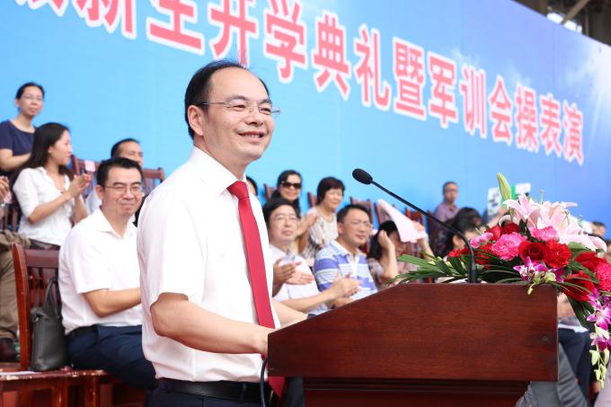 党委副书记、校长杨小云代表学校党委、行政对2017级新同学的到来表示热烈的欢迎,向为同学们实现大学梦想任劳任怨、无私奉献的家长们表示崇高的敬意,对开云军训自训工作给予了充分肯定。他以《从“众”到“人”,做善于思考的大学生》为主题为新生上了开学第一课。杨小云以先贤为例,将独立思考的品质延展,希望每个同学都能清楚认识自己的优势与方向,崇尚真理,尊重科学,独立思考、敢于创新,努力培养自己的创造力与想象力,从附和众人、人云亦云的人转变为独立自主、独立思考的人。最后,杨小云激励全体新生:未来四年,希望你们把远大理想、家国情怀和书生意气汇入到自己的学习与实践中,心忧天下,敢为人先,力学笃行,不负青春!