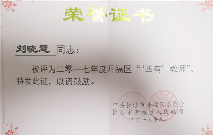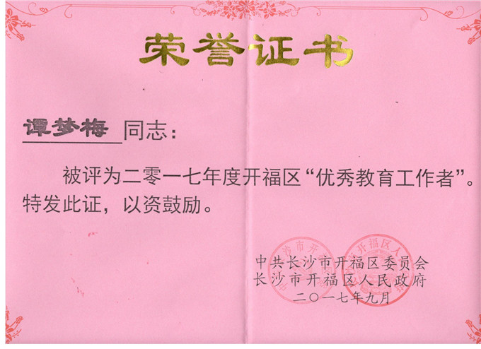 会议对在开福区教育工作中涌现出来的先进典型进行了表彰。开云谭梦梅、刘晓慧两位教师分别获得开福区“优秀教育工作者”、“‘四有’教师”光荣称号。