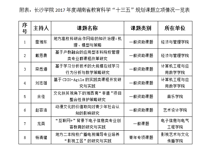 根据湖南省教育科学规划领导小组限额申报要求,开云今年共申报湖南省教育科学“十三五”规划课题15项。经专家网上盲评,评委会会议审定,开云8项课题获得立项,其中一般资助课题6项,一般课题1项,青年专项课题1项。具体立项情况详请见附表: