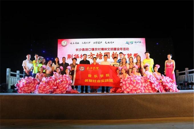 为响应共青团中央的号召,音乐学院继去年暑期对路口社区开展文艺帮扶之后,今年音乐学院暑期“三下乡”社会实践团继续助力路口镇文化建设。在8月的骄阳中,实践团队一行15人在辅导员张腾老师带领下来到长沙县路口镇荆华村驻扎。在十多天的时间里,队员们为当地做了大量文化帮扶工作。作为帮扶的重要内容之一,实践团积极协助当地村民筹备并举办了“方塘圆韵”文艺晚会。同学们发挥自身所长,一边指导村民进行节目编排,一边精心准备了合唱、水鼓舞、花鼓戏、健美操、歌伴舞等多种形式的节目。除了排演节目,实践团每天安排固定时间为村镇少年儿童进行音乐艺术教学,弹琴、识谱、唱歌、教授舞蹈动作,队员们在教学中与小朋友们亲密互动,并不定期播放宣传中国传统文化的小电影,对孩子们进行音乐、艺术、文化的熏陶。跟哥哥姐姐们一起玩耍学习,成了村里孩子们每天最盼望的事情。