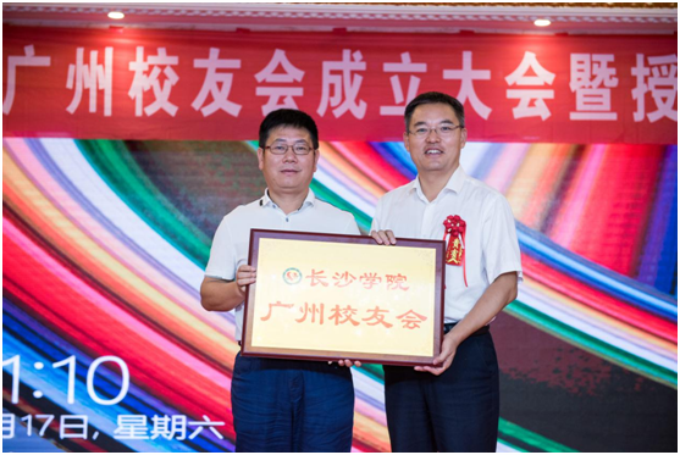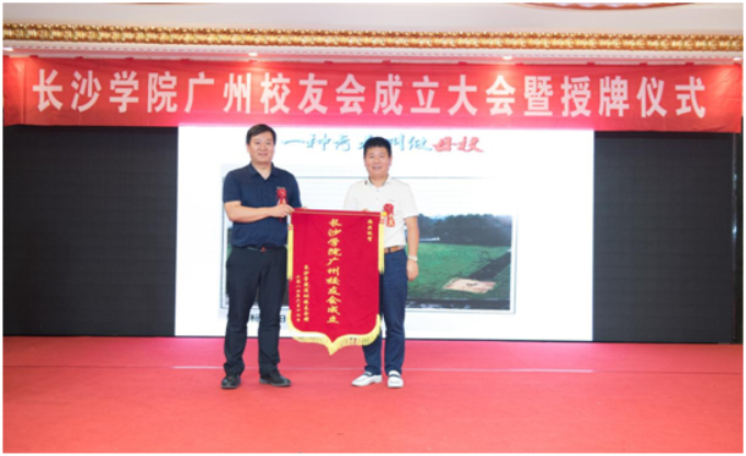 现任深圳市华移科技股份有限公司董事长的深圳开云kaiyun官方网站校友会会长肖正君为广州校友会送来锦旗,并承诺深圳校友会向各地校友敞开怀抱,共享资源,共谋发展。
