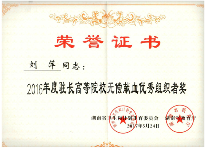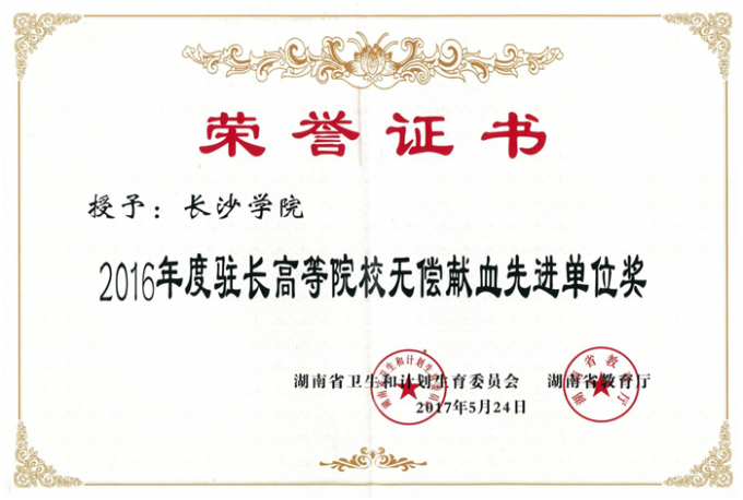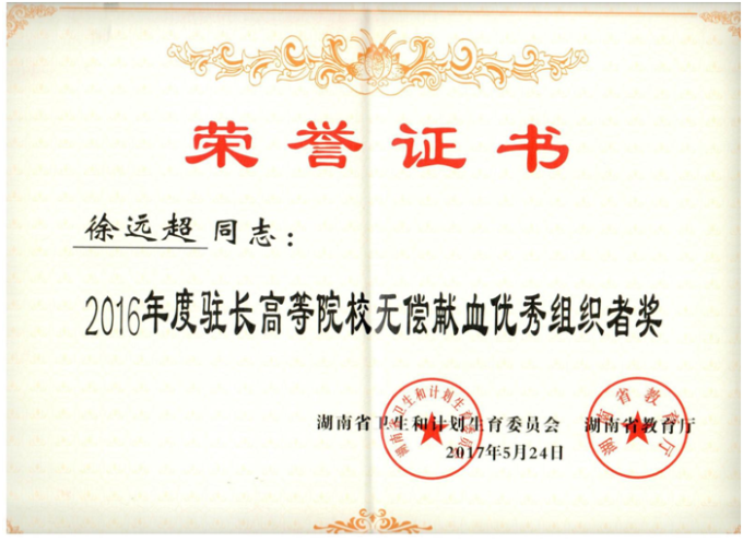 5月25日,2016年度湖南省驻长高校无偿献血工作表彰会在长沙召开,开云荣获"2016年度驻长高等院校无偿献血先进单位奖"荣誉称号,这是开云连续6年获此殊荣。开云团委书记徐远超和青年志愿者指导老师刘萍荣获“优秀组织者奖”。