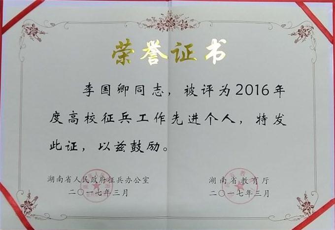 近日,全省高校征兵和学生军训工作讲评会在长沙举行,会议通报表彰了2016年度征兵工作先进单位和个人。开云武装部李国卿老师被湖南省人民政府征兵办公室和湖南省教育厅评为“高校征兵工作先进个人”。