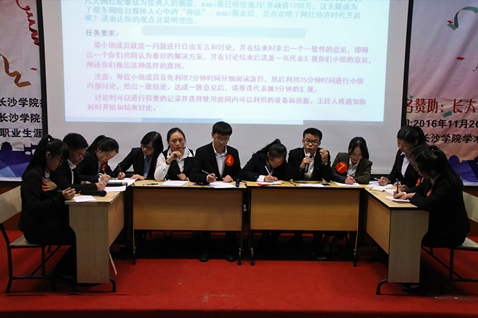 “无领导小组讨论”考察选手的综合能力。选手们对“papi酱走红,是否说明了网红经济时代开启呢?”进行25分钟的讨论,得出一致性意见后选一个代表做3分钟的汇报。评委对选手在讨论过程中的表现提出了问题及建议。