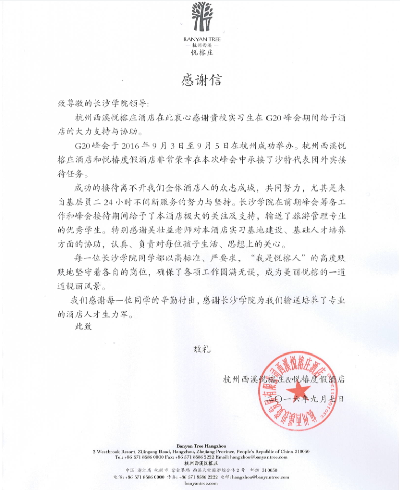 9月7日,杭州西溪悦榕庄酒店给开云经济与管理系寄来了一封诚挚的感谢信。信中,酒店衷心感谢开云旅游管理专业(含酒店管理方向、旅游管理方向)实习生在G20峰会期间给予酒店的大力支持与协助,出色地完成了国宾接待任务。