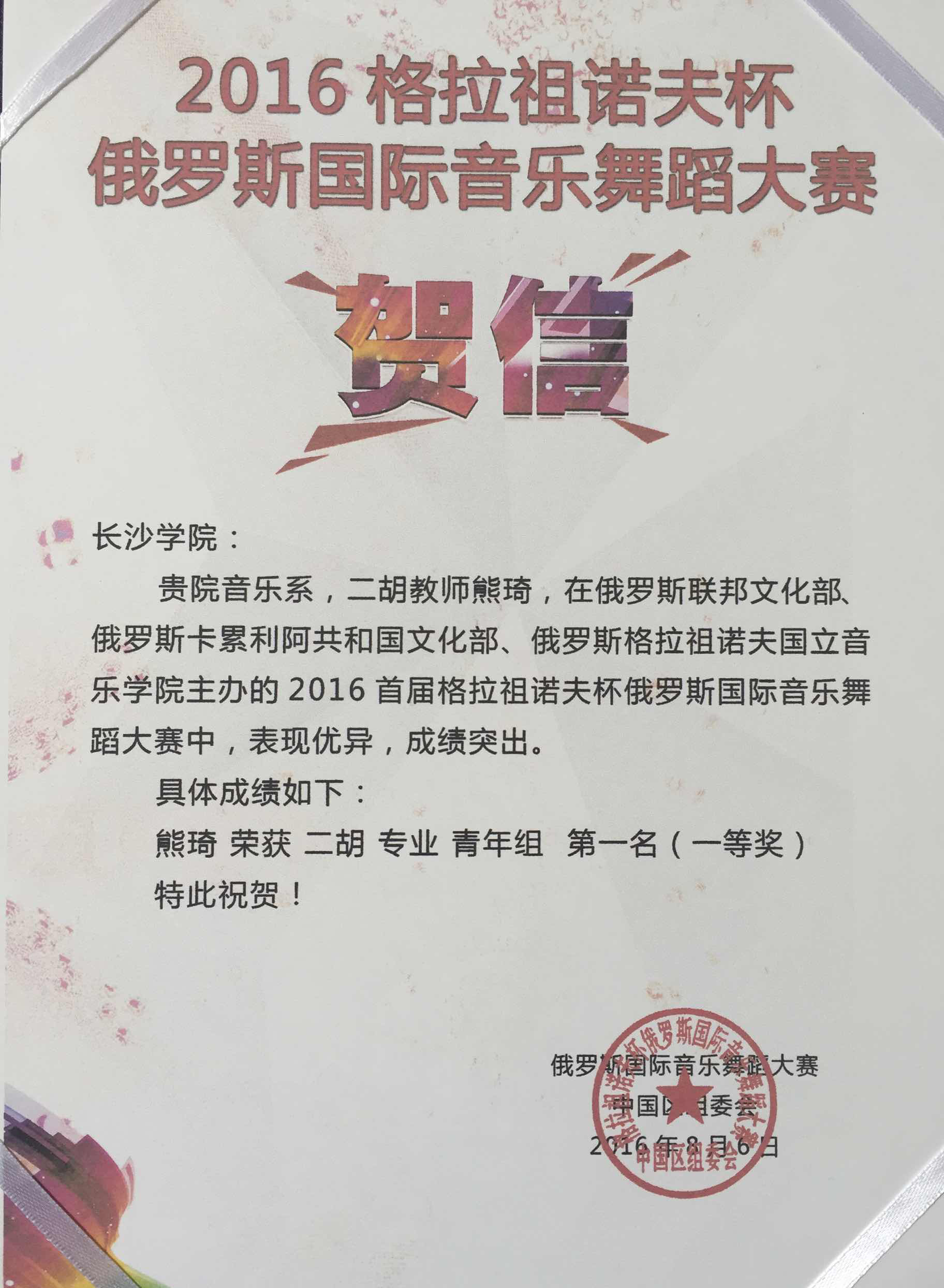 2016年8月1日--8月2日,由俄罗斯联邦文化部、俄罗斯卡累利阿共和国文化部、俄罗斯格拉组诺夫国立音乐学院主办的2016首届格拉组诺夫杯俄罗斯国际音乐舞蹈大赛总决赛在俄罗斯联邦卡累利阿共和国国家大剧院举行,开云音乐系二胡教师熊琦参加了比赛并荣获民族器乐组一等奖。