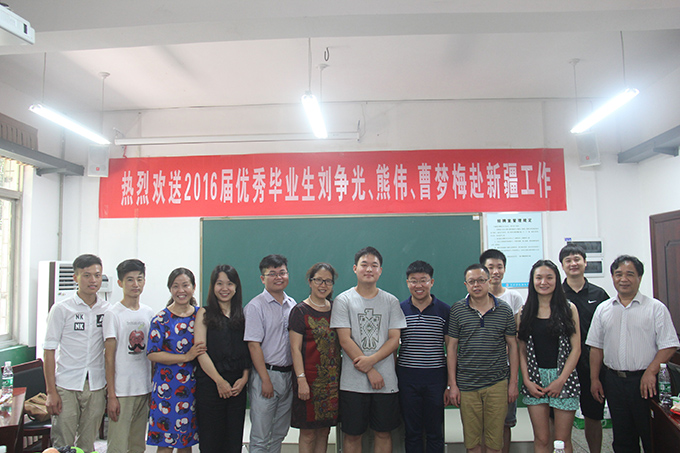 欢送会上,三位同学汇报了他们立志赴疆工作的心路历程;表达了对母校、老师的培养教育的感恩之情。招就处处长夏湘远受张世英副院长委托对三位学生寄予了期望和祝愿。他强调:第一,援疆是国家战略发展计划,同学们参与其中无限荣光;第二,做人一定要有目标有梦想,赴疆工作虽有一定挑战,但要不怕苦,勇闯一番事业;第三,要做一个有思想境界的人,不怕心灵的孤独,不畏前路的艰辛!同时,他叮咛三位学生,要加强与当地相关部门、在新疆工作的校友联系,加强核母校联系,有困难及时汇报,母校永远是他们的精神家园和坚强后盾。