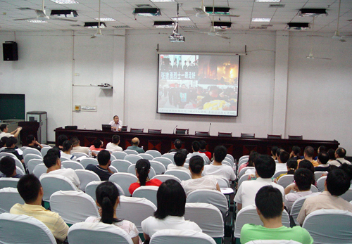 2009 年7月7 日下午,湖南省消防安全教育工委会的杜亮教官在科技楼学术报告厅作了一场消防安全知识讲座。学校三级消防安全责任人认真听取了讲座。讲座由副院长宋达主持。