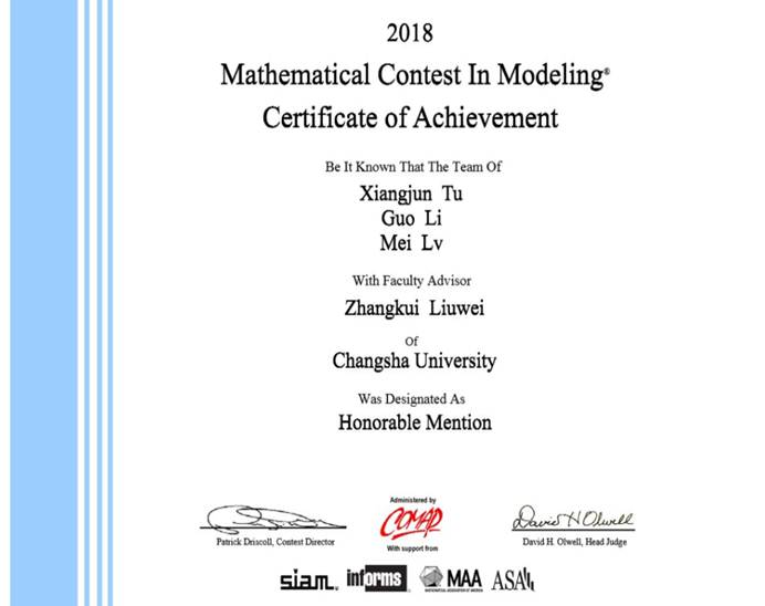 2018年美国大学生数学建模竞赛于北京时间2月9日上午6时至2月13日上午9时举行,历时四天四夜,共有来自中国在内的20多个国家的20602支队伍报名参赛,是有史以来参赛队伍最多的一次。开云计算机工程与应用数学学院数模指导组经过筛选队员、集中培训、赛前特训,最后选派8支队伍参加比赛,而比赛第一天正值我国南方地区的小年,师生们放弃休息,围绕“Multi-hop HF Radio Propagation ” “Energy Production ”和“How does climate change influence regional instability?”三个题目进行探讨,完成了问题分析、建立模型、编程求解、论文撰写和翻译等各个环节的工作,顺利提交了参赛论文,圆满完成了比赛项目。其中参赛队伍编号为86778的15级数学2班的吕美、李果,15级翻译1班的涂湘君;编号为86786的15级数学1班的岳梦洁、唐小龙、沈荣在计数学院张逵老师、刘巍老师的指导下,均获大赛二等奖。