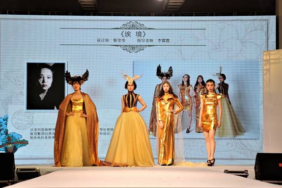以“立夏”为主题的毕业T台秀在一段青春活泼的开场舞中拉开帷幕。在柔美的音乐声中,身着《缁衣》与《瑶台星海》主题服饰的模特款款向我们走来。该作品运用了晚清服饰的元素,将清代服饰的高雅、华贵与现代服饰审美相结合,使传统服饰散发出新的生命。《Eery Carnival》主题服饰的设计灵感来源于风格鲜明的波普艺术,作品造型张扬怪诞、形式变化多样、色彩丰富明快,让人眼前一亮。《埃境》主题服饰将古代埃及服饰的造型特点吸纳到现代时装设计中,运用夸张奇特的造型还原了古埃及人非凡的创造力和想象力,整个设计既有历史的厚重,又充满现代的激情,赢得观众阵阵掌声。