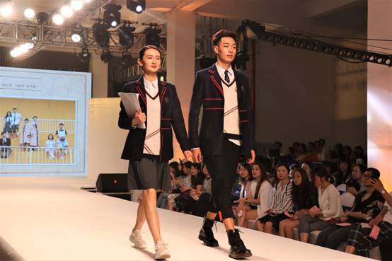 现场除了展出31位服装与服饰设计专业2018届毕业生的设计作品外,还发布了艺术设计学院艺术实践工作坊团队的设计作品《校服》。该作品由7名服装与服饰设计专业的在校学生设计,曾获得湖南省第五届大学生艺术展演活动二等奖。作品设计灵感来源于校内教学楼的色彩和园林造型,设计者结合校徽与龙凤图案以及四季的校园景色,设计出了春、夏、秋、冬四个季节的校服和一套夏季运动装,五套服装皆承载了设计者对校园的热爱与记忆。T台上,同学们自己做模特,穿上自己设计的校服,定格出一幕幕活力十足的校园场景,将活动氛围推向高潮。