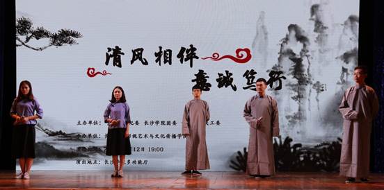 本次晚会内容丰富,内涵深远。晚会共九个节目,都以“诚信与廉洁”为主题,充分发挥了播音与主持、编导、新闻、汉语言文学专业的优势,由同学们自编自导自演完成。“清风者,云水襟怀,松柏气概。”伴着慷慨激昂的背景音乐,李峻教授创作的《清风相伴,意诚笃行》诗朗诵铿锵有力。“长痛汉皋埋碧血,难从海国问红妆”,话剧《向警予之家国情怀》演绎了湖南女英雄向警予的英勇事迹,革命先辈为革命事业不惜流血牺牲的英雄气概令人动容。朗诵《若为人生故诚信不可抛》《为政尚德,以德促廉》表达了对诚信的敬畏、对廉洁的向往。话剧《一口唾沫一个钉》展现了青年创业者夏天坚守诚信,与不法分子斗智斗勇并最终事业爱情双丰收的故事。校园情景剧《诚信校园行》通过普通大学生小月评定助学金的故事,启迪青年学子要诚实做人,踏实走好人生每一步。