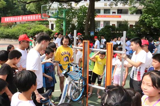 活动分为美好生活展示、实验竞答互动、生活中的科技三个部分。美好生活展示区是由四块展板组成,分别从衣食住行四个方面展示了人民生活的变化;实验竞答互动区设有科学小实验和知识竞答,互动环节生动有趣;生活中的科技区由机电工程学院展示大学生科技创新作品,作品依次摆放,项目负责人现场进行讲解和演示。其中,由该院庞小兵老师带领团队设计的“自行车立式停放装置”吸引了不少孩子围观。孩子们一边观看一边表达自己的好奇和疑问。据悉,该作品已经进入第八届全国大学生机械创新设计大赛一等奖的角逐。