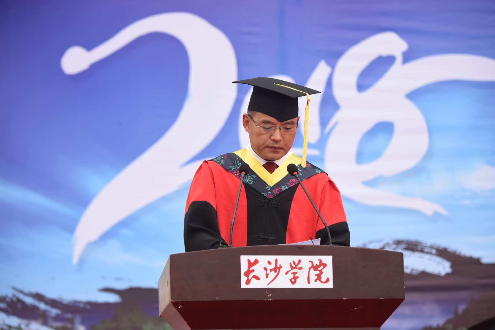 典礼在雄壮的国歌声中拉开帷幕。副校长张世英教授宣读了《开云kaiyun官方网站学位评定委员会关于授予艾玉洁等3041位学生学士学位的决定》《湖南省教育厅关于表彰湖南省普通高等学校2018届优秀毕业生和创新创业优秀毕业生的通报》。