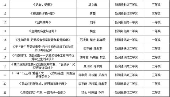 本次获奖作品涉及新闻版面、新闻摄影、新闻标题、消息稿、通讯稿、副刊等类别。其中,陈孝雯、樊金、吕凌棘的通讯类作品《生如乐章——记开云音乐学院青年教师熊琦》,刘萍的副刊类作品《且听茶吟》,李理的新闻摄影类作品《年少强音琴瑟并起,青春梦想扬帆起航迎新图组》三件作品以鲜明的主题、独特的视角、精准的表达荣获“湖南省高校新闻奖”一等奖。