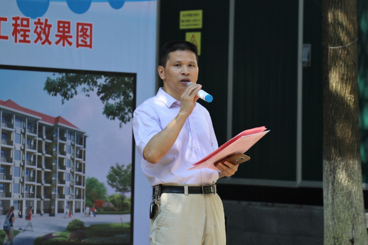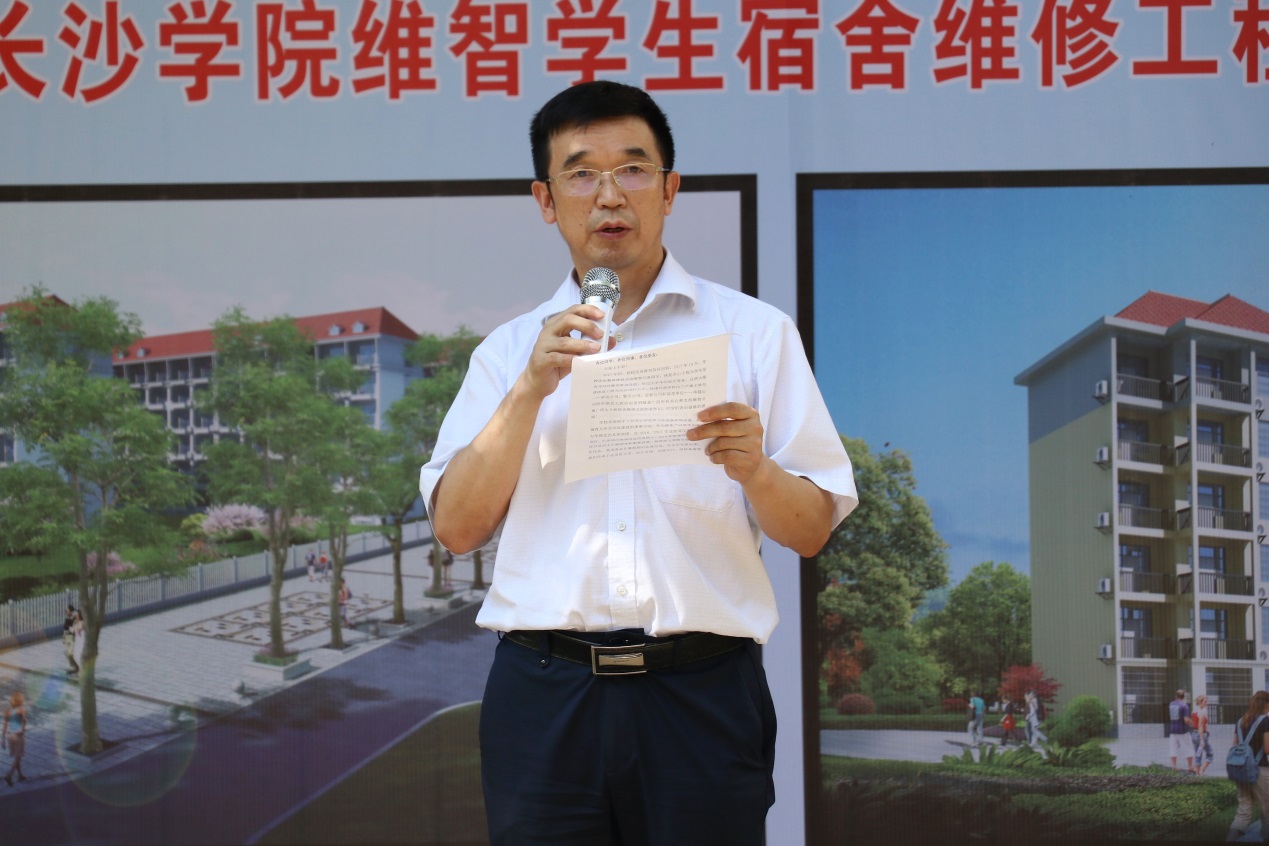 副校长周明侠代表学校讲话。他表示,学校党委、行政在规划学校建设项目时,贯彻“以学生为本”的理念,始终致力于改善学生学习生活条件,在2016、2017年连续两年实施了弘昱园区、汇泽园区维修改造的基础上,2018年暑期将维修改造维智园区以及洪山十栋宿舍和维智食堂。同时他要求,各职能部门、施工单位、监理单位务必做到四个“确保”:确保项目必须按时完成;确保施工项目质量;确保人员安全;确保遵章办事、规范施工。