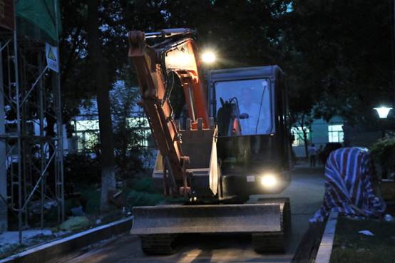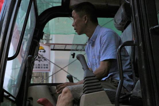开挖掘机的文师傅主要负责搬运大型的建筑垃圾以及挖凿要改造的路面。为了加快工程进度,他会加班及时处理建筑垃圾。