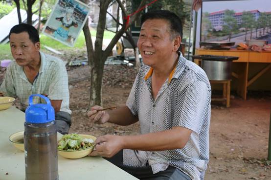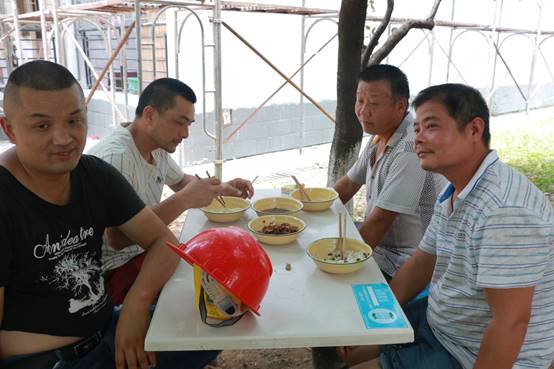 下午6点半,气温33℃,体感温度38.7℃。朱师傅买好饭坐在餐桌前,脸上露出会心的笑容。茶足饭饱过后,便回到员工宿舍歇凉。晚上,他会和家人通个电话,报声平安,还会和工友们一起聊天。