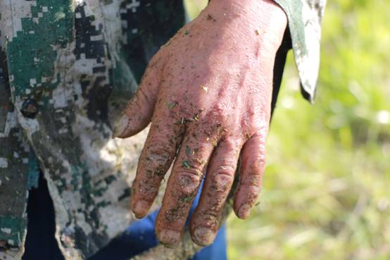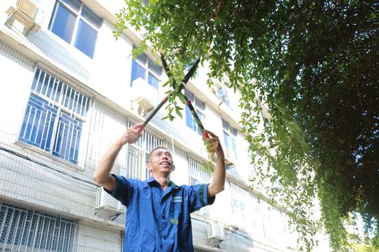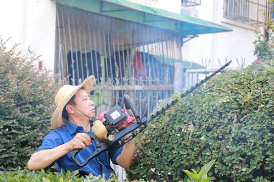 靠近来往车辆较多的福元路,加上太阳的炙烤,北校门附近树上的知了都热得不吭声了,陈长发就在这一块区域修割草地。手中的割草机器有四五十来斤重,作业时机器震得他的双手不停颤抖,经常操作这台机器,他的手十分粗糙。除了割草这项繁重的工作,陈长发还要定期清理学校的化粪池,工作量很大。
