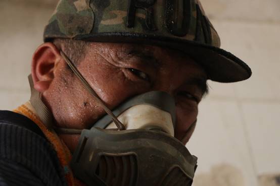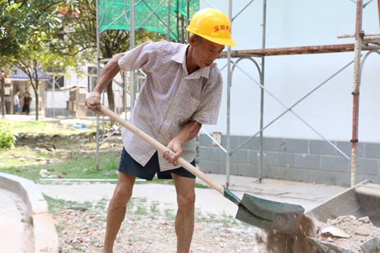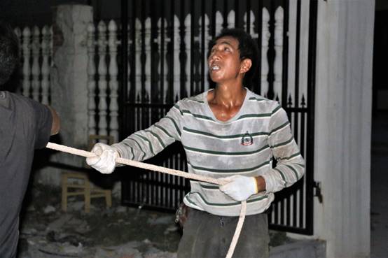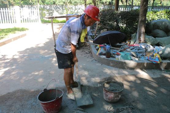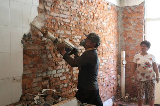 来自河南的廖国军和任绣芹是这个施工单元比较有名的夫妻档。廖国军负责用电锤拆毁需要改建的墙壁和地面,任绣芹负责帮忙把廖国军拆毁的大块废砖和水泥块扔到外面。廖国军全身都汗湿了,帽檐的汗水止不住地往下滴。当被问及既然这么热、出了那么多汗为什么还要穿这么厚的衣服时,他笑着说:“没办法,使用电锤时,墙壁上的瓷砖碎片会到处飞溅,不穿厚一点容易受伤。”