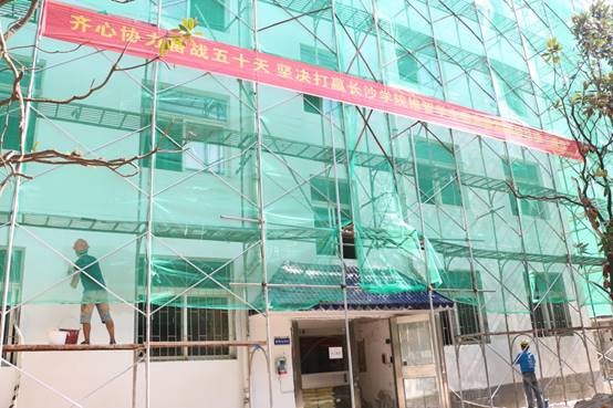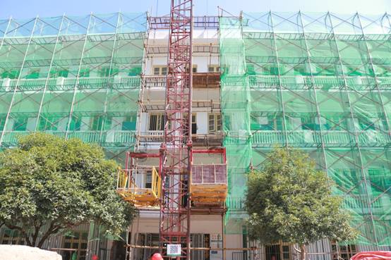上午8点,气温30℃,体感温度37.4℃。维智园区的工人早已进入工作状态。外墙全部用防护网围住,工人们戴上头盔紧锣密鼓地开展工作,为的是早日完成施工任务,开学时给学生们提供一个全新舒适的住宿环境。