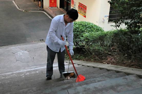 清扫台阶的工人名叫李飞龙,从宁静路一直清扫到第一办公楼前,他的工作已经持续了半个小时。他是这一大块区域的负责人,每天要对路面进行彻底清扫和垃圾搬运。清扫完宁静路、第一办公楼前坪,他还会去丽园路以及致远路进行大面积清扫。他说美化校园环境,为长大师生服务是一件光荣的事情。