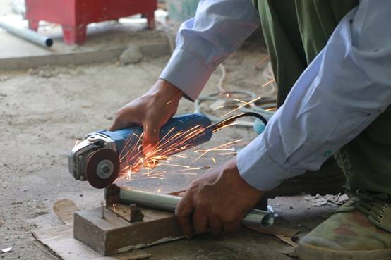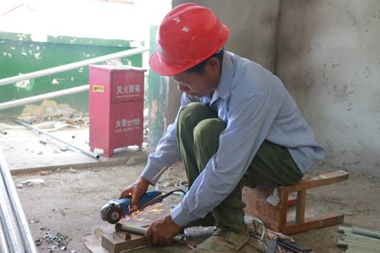 角磨机刘师傅在楼道口小心翼翼地切着一段又一段钢管,这是为焊接楼梯扶手而准备的。其要求质量高、精度准,不能长短不一。角磨机工作时擦出的火花四溅,因此刘师傅穿上长衣长裤以免被火花灼伤。