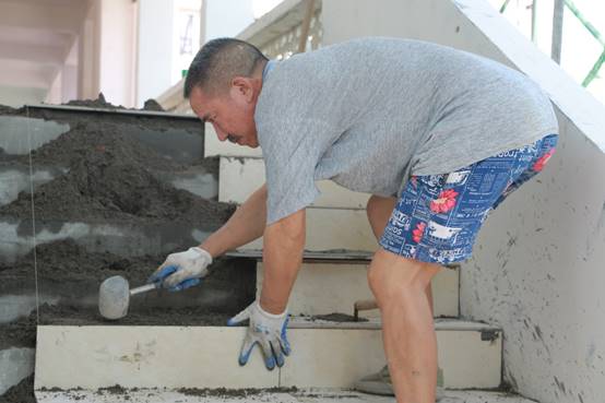 陈历宇在洪山十栋公寓室内贴地面瓷砖,他搬起一块瓷砖沿着地面标齐水平线不紧不慢地贴上去,左手扶着新贴上的瓷砖,右手用锤子把瓷砖锤紧,使其固定,动作娴熟而到位。