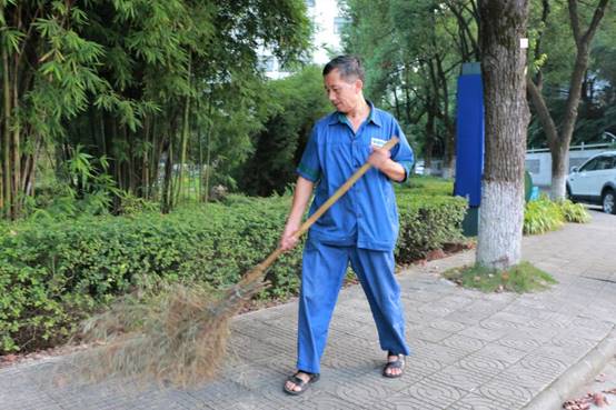拿着大扫帚,穿着工作服,在西南校门附近对路面进行清扫的蒋锡祥已经在学校工作了11年,离家200公里的他不能经常回老家看望亲人,为了更好的工作,他睡在员工宿舍,早晨五点起床,五点半开始上班。他身后清扫过的区域非常干净。