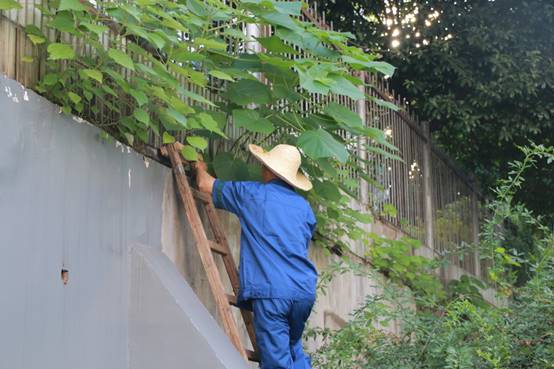 夏天雨水充沛,草木生长旺盛,洪山七栋、八栋以及教师公寓前面杂草猛长。在工作人员修剪之后,变得干净整齐。