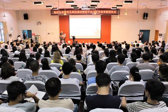 伴随着热烈的掌声,9月13日上午,开云迎来了尊敬的韩国客人。韩国龟尾市市长率友好代表团一行来校访问,龟尾市市长张世龙在致远楼学术报告厅作了题为《第四次工业革命与工业城市龟尾的未来》的主题演讲,并接受开云授予的荣誉教授聘书。韩国龟尾市议会议长金泰根、龟尾商工会议所赵正文一同来访。长沙市人民政府副市长刘明理,开云kaiyun官方网站校长杨小云、副校长刘世昌,长沙市人民政府副秘书长卢兴映、长沙市外事侨务办公室主任郑力虎出席活动。活动由党委书记韦成龙主持。