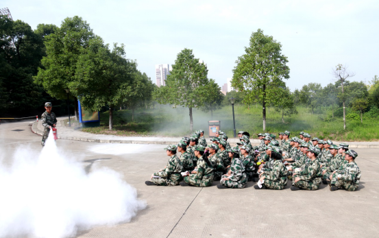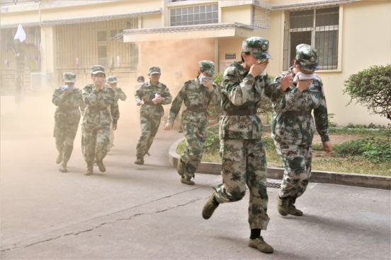 上午八点半,各军训教员组织新生进入园区进行消防准备。随着一声哨响,工作人员在三栋学生宿舍内分别点燃了烟雾弹。不一会儿,黄色的烟雾充斥着楼道,学生宿舍内的警报器响起。一名学生发现“火灾”后,立刻向宿舍管理员报告,宿舍管理员查看情况后,当即对起火宿舍进行断电,并请求两名军训教员吹响哨声通知新生有序疏散。新生们一只手拿着湿毛巾捂住口鼻,另一只手搭着前方同学的后背,弯着腰迅速撤离宿舍,跑到“安全地带”集合。与此同时,戴着防毒面具的义务消防队员手持灭火器前往失火点进行“灭火”。整场撤离与救灾过程不超过五分钟。随后,各军训教员组织各自连队的新生进行灭火器使用教学,并作正确示范。