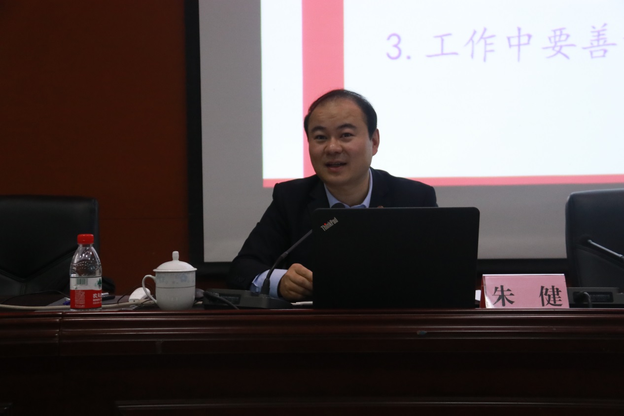 随后,朱健教授结合高等教育和大学生成长成才的实际,就如何学习习近平总书记的科学思想方法从十五个方面作了全面深入的阐述,即:要树立历史眼光,明确历史方位,勇于承担历史责任;要加强调查研究,做到情况明、底数清,走出“盲人摸象”的困境;要坚持问题导向,做到不惧怕问题,不害怕解决问题,坚持依靠发展解决发展中的问题;要坚持人民立场,了解学生所思所想,研究大学生的思想特点和成长规律,坚守教育公平正义;要确立战略思维,善于抢抓机遇,增强忧患意识,经常做到居安思危;要坚持系统思维,既谋子更谋势,善于调动和发挥多个积极性;要强化理论思维,不断加强学习,努力对标中央;要培养创新思维,积极探索适合自身发展需要的新道路、新模式;要强化底线思维,凡事从坏处准备,努力争取最好的结果,做到有备无患、遇事不慌,牢牢把握主动权;要坚持以小见大,坚持从具体问题抓起,从小事做起,抓大不放小,管好自己的生活圈、社交圈、朋友圈;要坚持知行合一,做到思想上高度认可,政治上坚决维护,组织上自觉服从,行动上紧紧跟随;要有钉钉子精神,一件接着一件抓,抓一件成一件,积小胜为大胜;要坚持分类指导,不搞“一刀切”、“齐步走”、 “一锅煮”,不用一把“尺子”论长短;要注重典型引路,发挥基层首创,以身边事教育身边人;要培养“三分法”思维,慎用“非此即彼”观点,坚持在对立统一中合理找刻度。