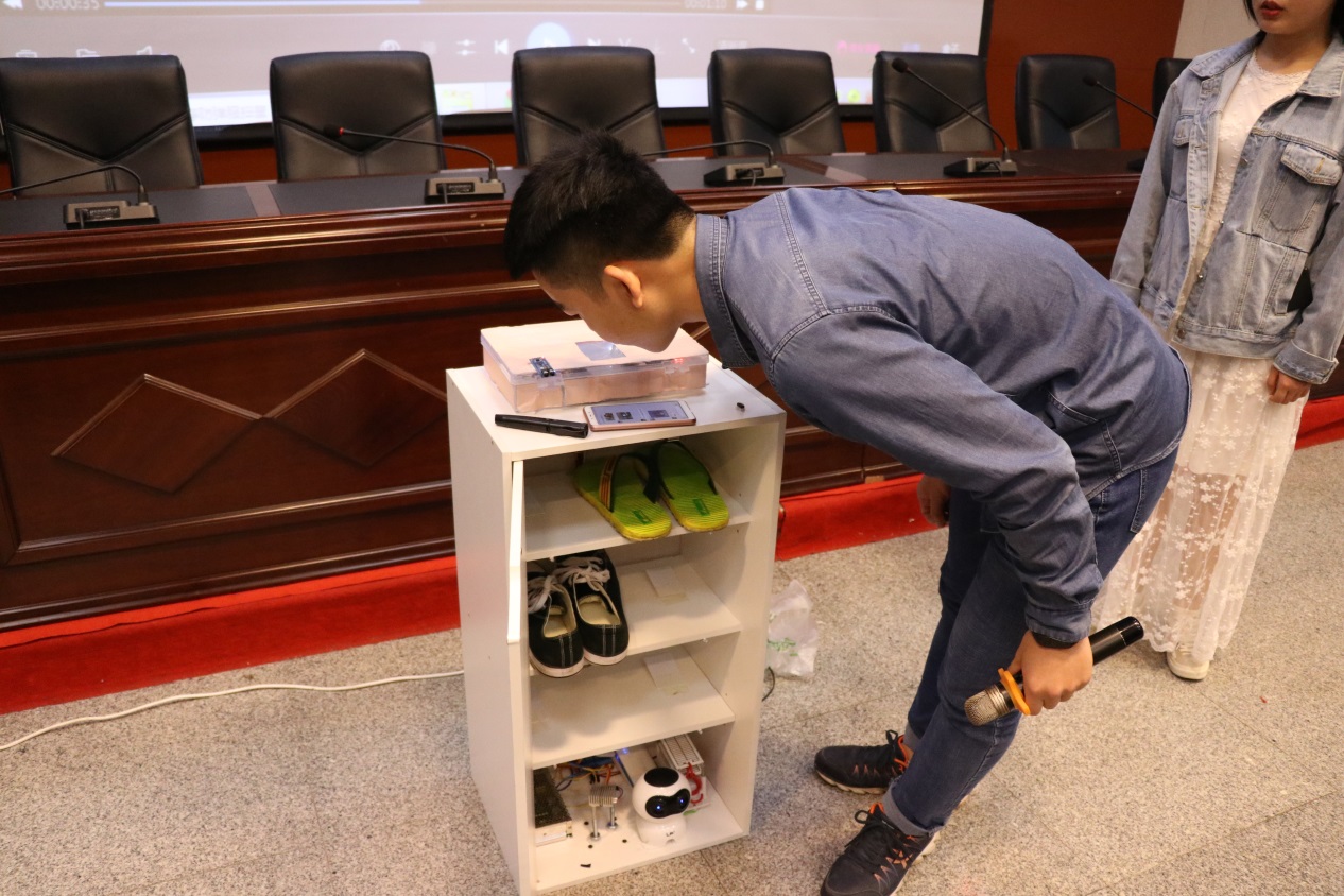 参赛选手现场演示智能鞋柜使用方法