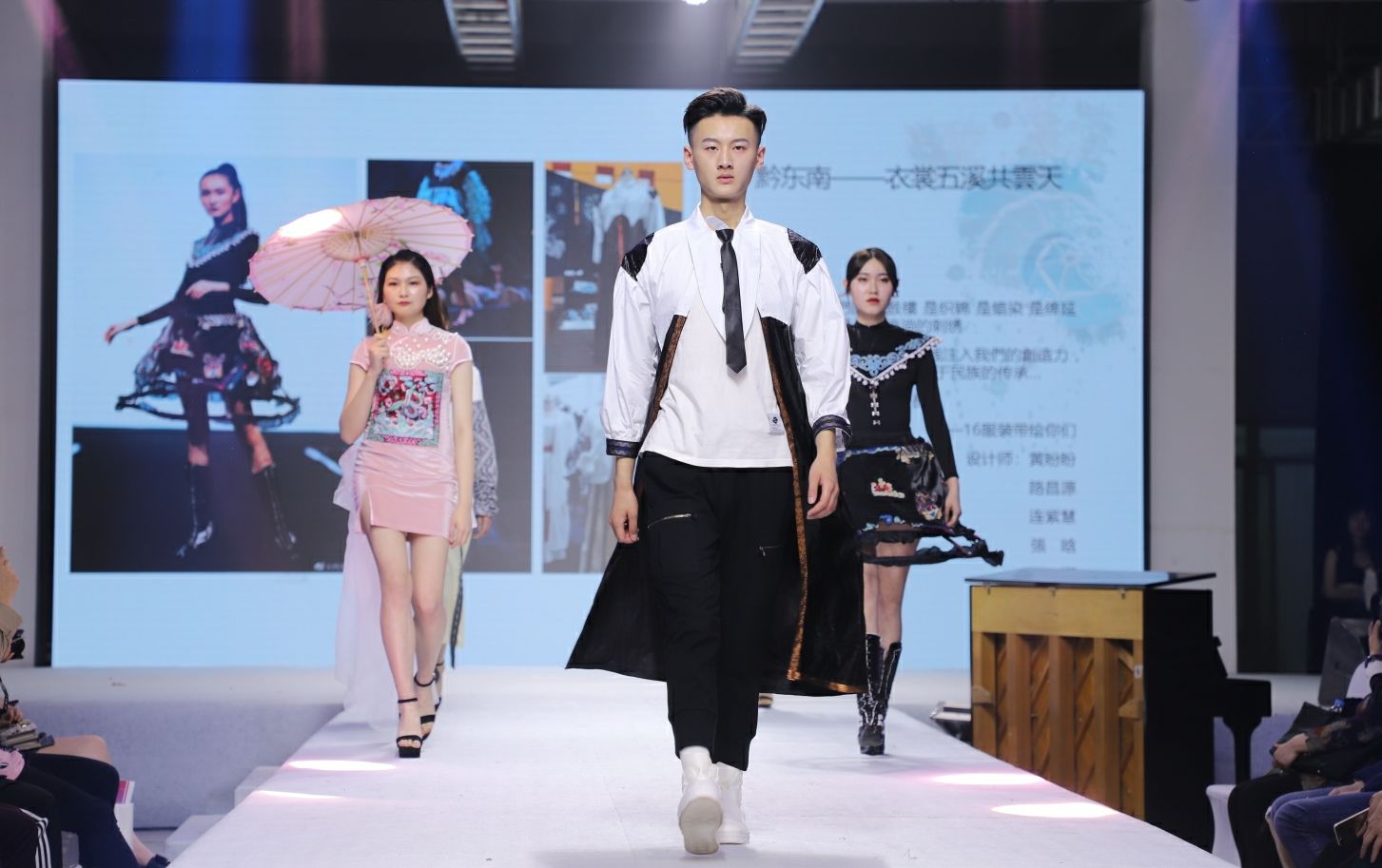 此外,现场还展示了艺术设计学院2016级学生在贵州调研的成果《黔东南——衣裳五溪共雲天》。该作品的设计灵感来源于黔东南苗族与侗族的民族服饰和风俗,体现了“民族的就是世界的”的设计理念。同时,现场还展示了湖南楚禾服饰有限公司旗下品牌“帧影”联合开云服装设计工作室设计的服装作品。