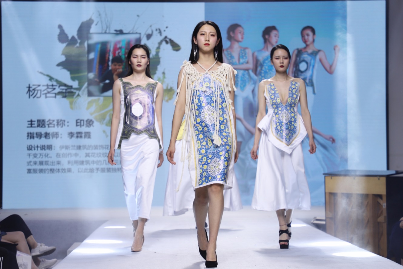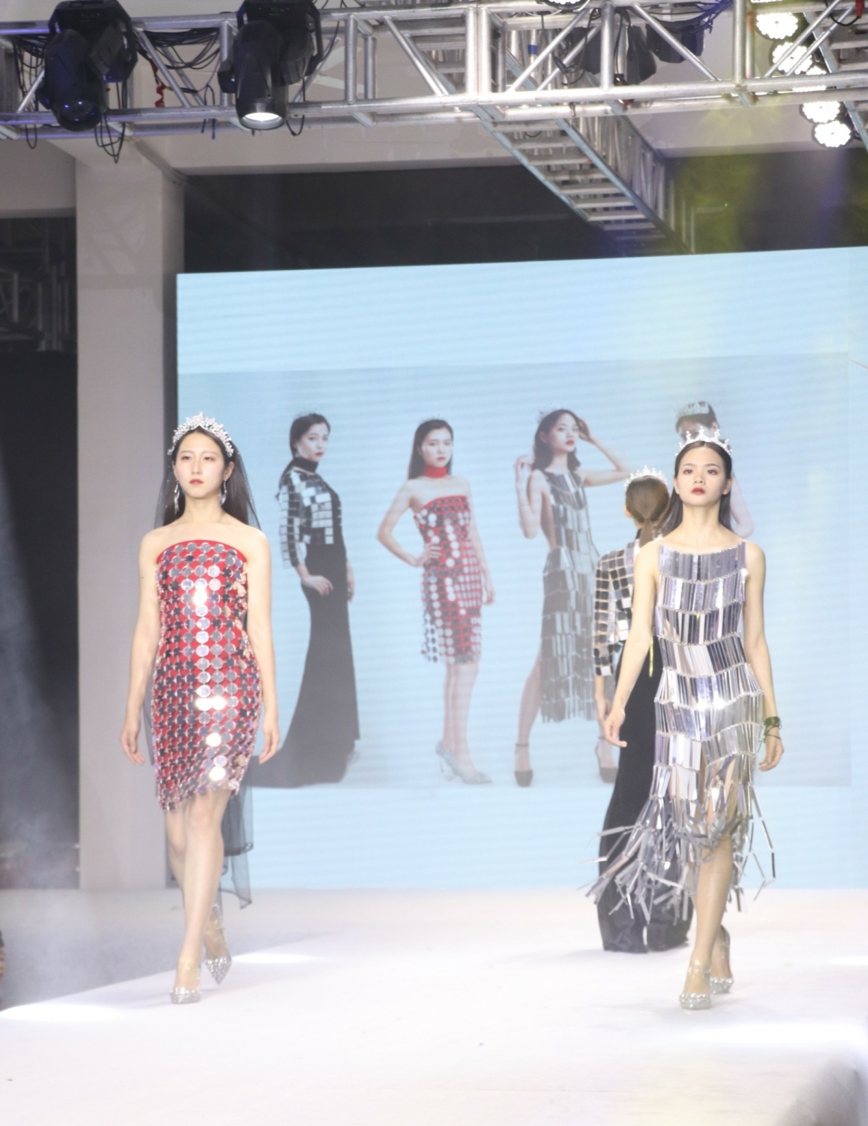 时装秀在音乐学院的乐器演奏《世上唯一的花》中拉开帷幕。现场展示的毕业作品共48个系列,192款服装设计。身着《琼华》主题服饰的模特首先出场。该作品运用了戏曲服饰的元素,将戏曲服饰的绚彩与现代服饰审美相结合,使传统服饰散发出新的生命,让人眼前一亮。《小丑的绿色城堡》作为本次服装展唯一的亲子装设计,其沉静温暖又不失生动活泼,使用了拼接与点缀的手法,颜色上进行了大胆撞色,形成新的风格。身穿《FOR WHOM THE BELL TOLLS》主题服饰的模特一出场就将现场气氛推向了高潮,该作品从反战元素中提取的几何图形按规律排列组合,塑造出硬朗的外形轮廓,将人体自身曲线掩盖,从而达到另类的视觉效果,赢得现场观众阵阵掌声。