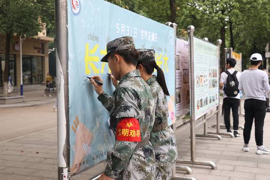 系列活动包括“禁烟宣传”“清扫烟头”及“禁烟巡逻”三个部分。当天中午,在勤思广场的禁烟宣传资料前,2018级旅游2班的谢梦婷同学向大家介绍了吸烟的危害,倡导大家拒绝香烟,养成健康文明的生活方式。参加活动的同学们纷纷在“校园无烟日”的签名墙上留下姓名。国旗班的同学们则牵头开展了校内“禁烟巡逻”,大家化身禁烟劝导员,劝阻校内吸烟人员。