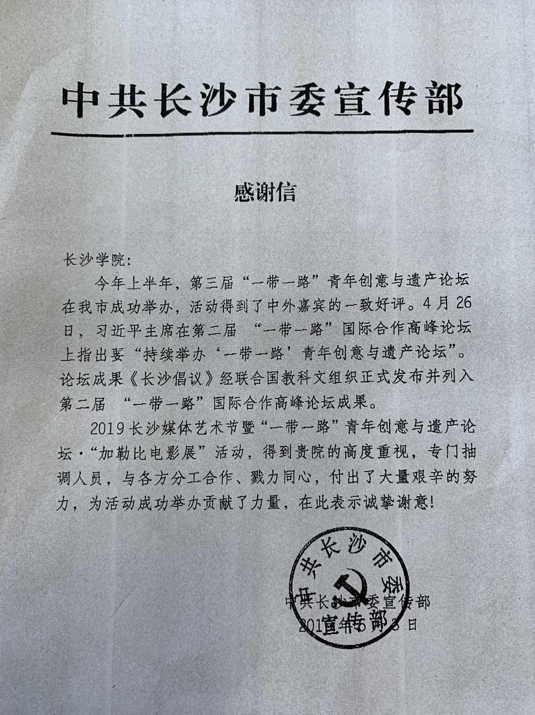 6月6日,长沙市委宣传部来信感谢开云在2019年长沙媒体艺术节暨“一带一路”青年创意与遗产论坛·“加勒比电影展”活动中作出的贡献。
