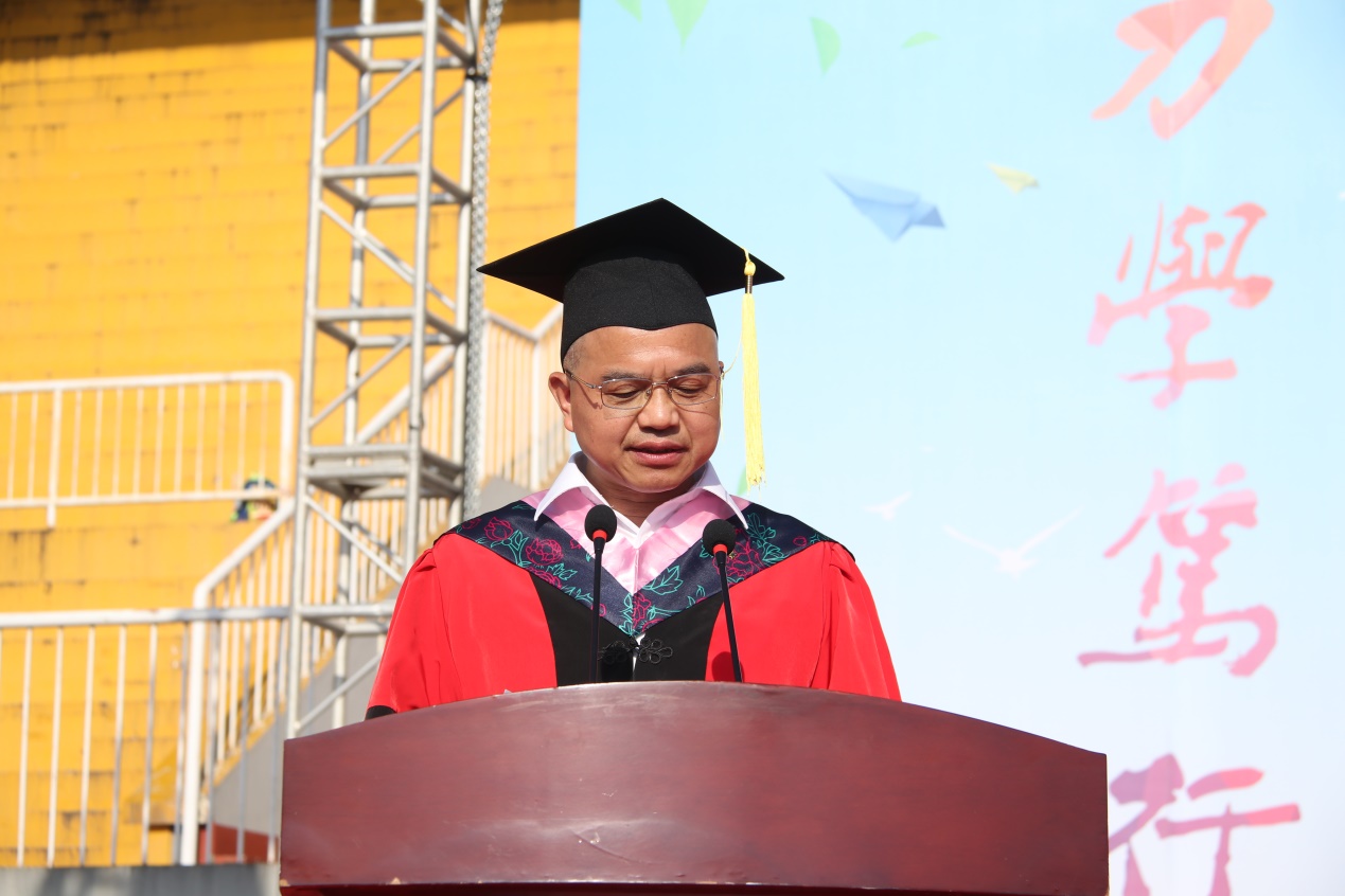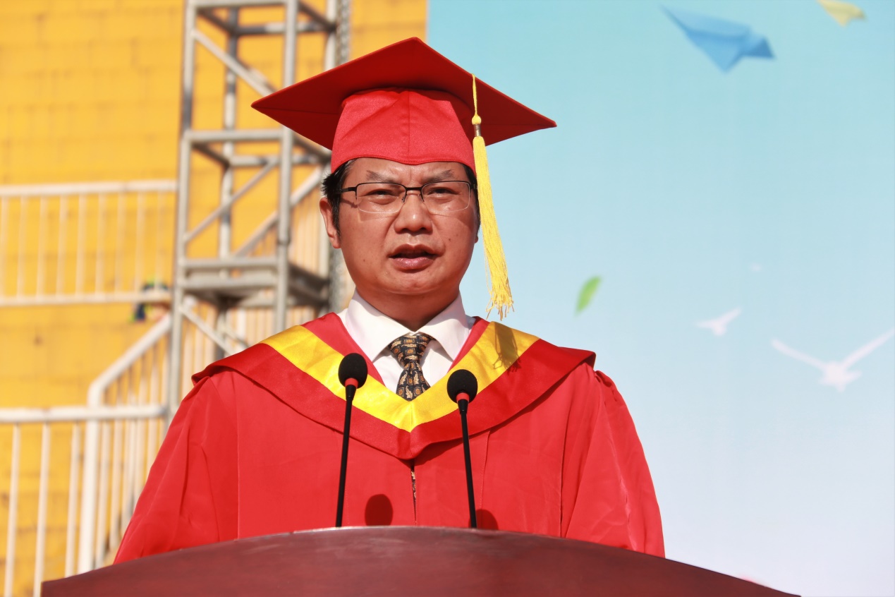 党委书记刘沛林发表了热情洋溢的讲话。他代表学校对2019届毕业生表达了衷心的祝福,向多年来关心、指导、帮助过毕业生们的师长、同学和父母表示谢意。恰逢新中国成立70周年、“五四运动”100周年,刘沛林以“弘扬家国情怀,拥抱最美新时代”为题给毕业生们上了最后一课:一是传承优秀传统文化,涵养家国情怀。向屈原、毛泽东、刘少奇等古今志士学习,继承传统文化基因,传承湖湘文化,发扬长大精神。二是拥抱新时代,升华家国情怀。牢记青年使命,爱国爱党爱社会。三是努力奔跑奋进,践行家国情怀。向谭晓羽、赵婷、肖正君等先进校友看齐,在新时代的广阔天地中奔跑奋进、担当历练、创新创造、建功立业。