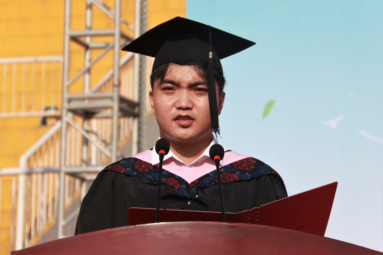 毕业生代表、艺术设计学院的王嘉鑫同学讲述了自己在长大成长的过程,表达了对母校的眷恋与不舍。他表示,以后会不忘初心、牢记使命,发挥先锋模范作用,在奉献与奋斗中实现人生价值,做无愧于心的“长大人”。