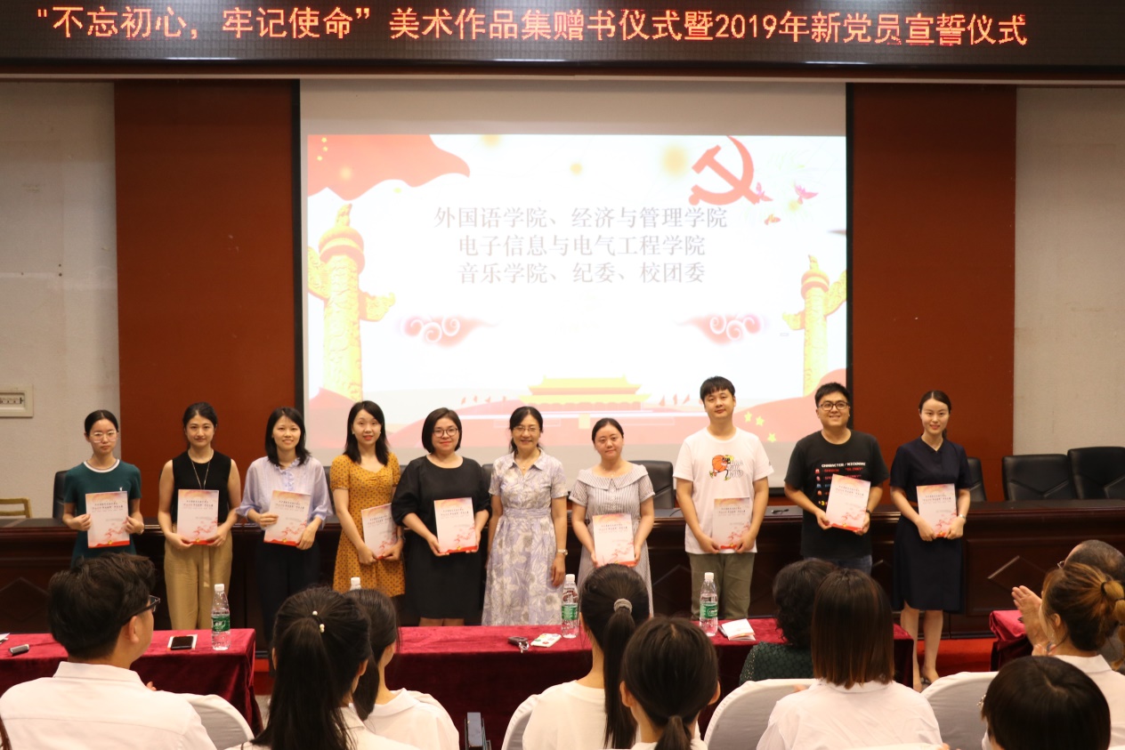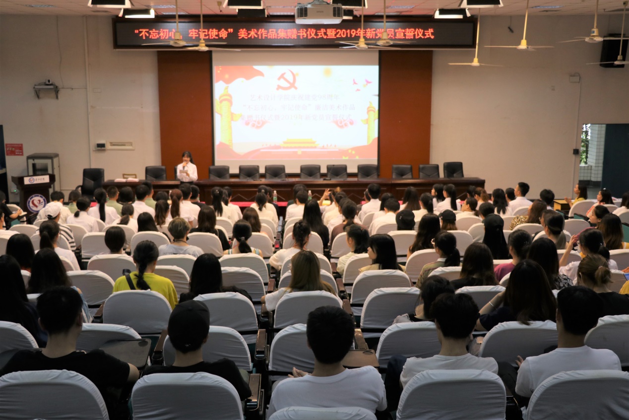 6月27日下午,艺术设计学院在致远楼学术报告厅开启, “不忘初心、牢记使命”廉洁美术作品集赠书仪式暨2019年新党员宣誓仪式。党委委员甄洁洪出席活动,艺术设计学院领导和主要负责人、教师代表、学生党员及预备党员和入党积极分子等参加了活动。