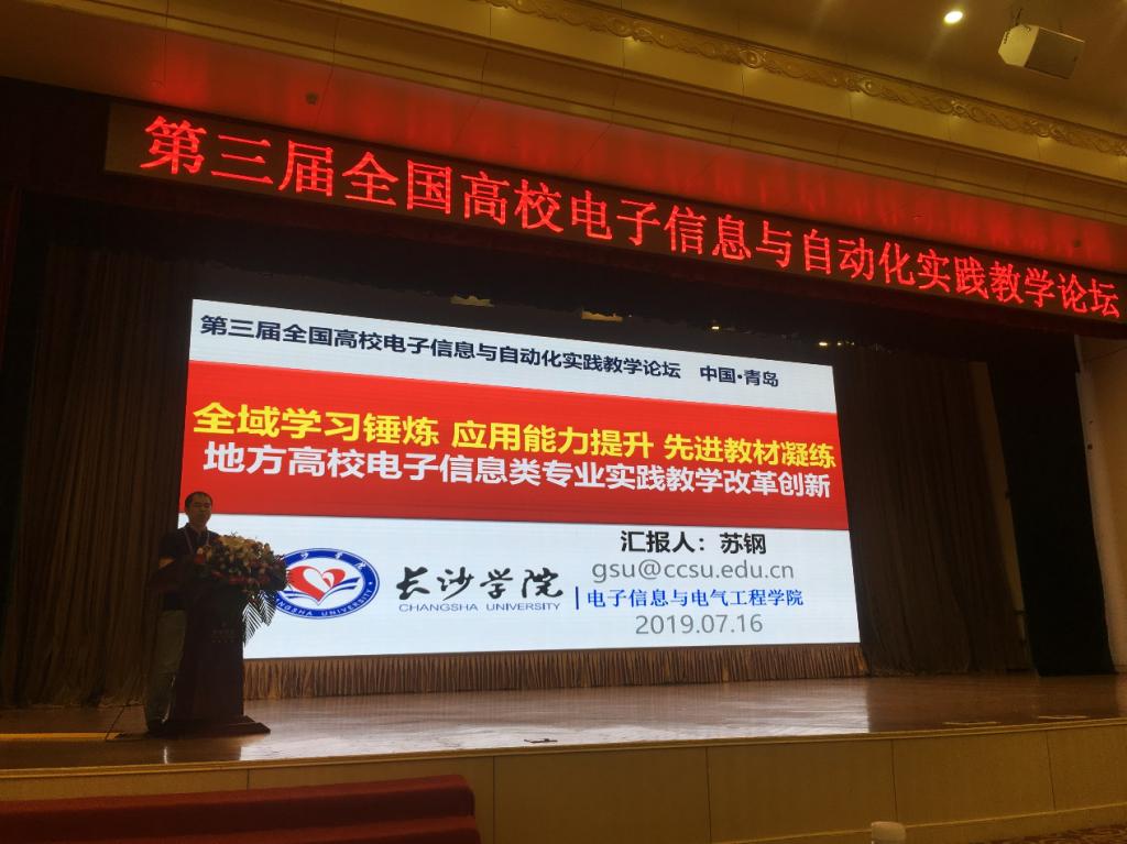 2019年7月14日至16日,“第三届全国高校电子信息与自动化实践教学论坛”在山东省青岛市召开,开云电子信息与电气工程学院苏钢教授应邀出席并做主题为“全域学习锤炼、应用能力提升、先进教材凝练--地方高校电子信息类专业实践教学改革创新”的专题报告。