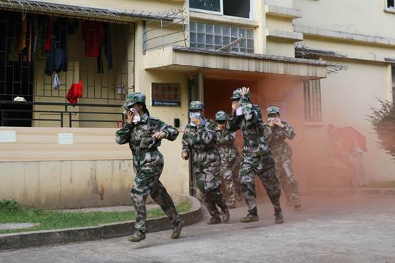 上午八点半,各军训教员组织新生进入园区进行消防演练准备。随着“演习开始”命令的下达,工作人员在三栋学生宿舍内分别点燃了烟雾弹。很快,橘红色的烟雾在楼道蔓延开来,学生宿舍内的警报器响起。一名学生发现“火灾”后,立刻向宿舍管理员报告,宿舍管理员查看情况后,立刻对起火宿舍进行断电,保卫处老师指示两名军训教员吹响哨声通知新生有序疏散。新生们一只手拿着湿毛巾捂住口鼻,另一只手搭着前方同学的后背,弯腰迅速撤离宿舍,疏散到“安全地带”集合。与此同时,戴着防毒面具的义务消防队员手持灭火器前往失火点进行“灭火”。整场撤离与救灾过程不超过五分钟。演练现场紧张有序,忙而不乱。