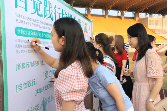 “青年兴则国家兴,青年强则国家强”,三百多名团学干部在国旗下庄严宣誓,随后在“垃圾分类,从我做起”活动展板处签下自己的名字。